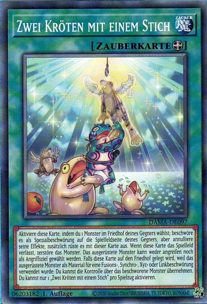 Aktiviere diese Karte, indem du 1 Monster im Friedhof deines Gegners wählst; beschwöre es als Spezialbeschwörung auf die Spielfeldseite deines Gegners, aber annulliere seine Effekte, zusätzlich rüste es mit dieser Karte aus. Wenn diese Karte das Spielfeld verlässt, zerstöre das Monster. Das ausgerüstete Monster kann weder angreifen noch als Angriffsziel gewählt werden. Falls diese Karte auf den Friedhof gelegt wird, weil das ausgerüstete Monster als Material für eine Fusions-, Synchro-, Xyz- oder Linkbeschwörung verwendet wurde: Du kannst die Kontrolle über das beschworene Monster übernehmen. Du kannst nur 1 „Zwei Kröten mit einem Stich“ pro Spielzug aktivieren.